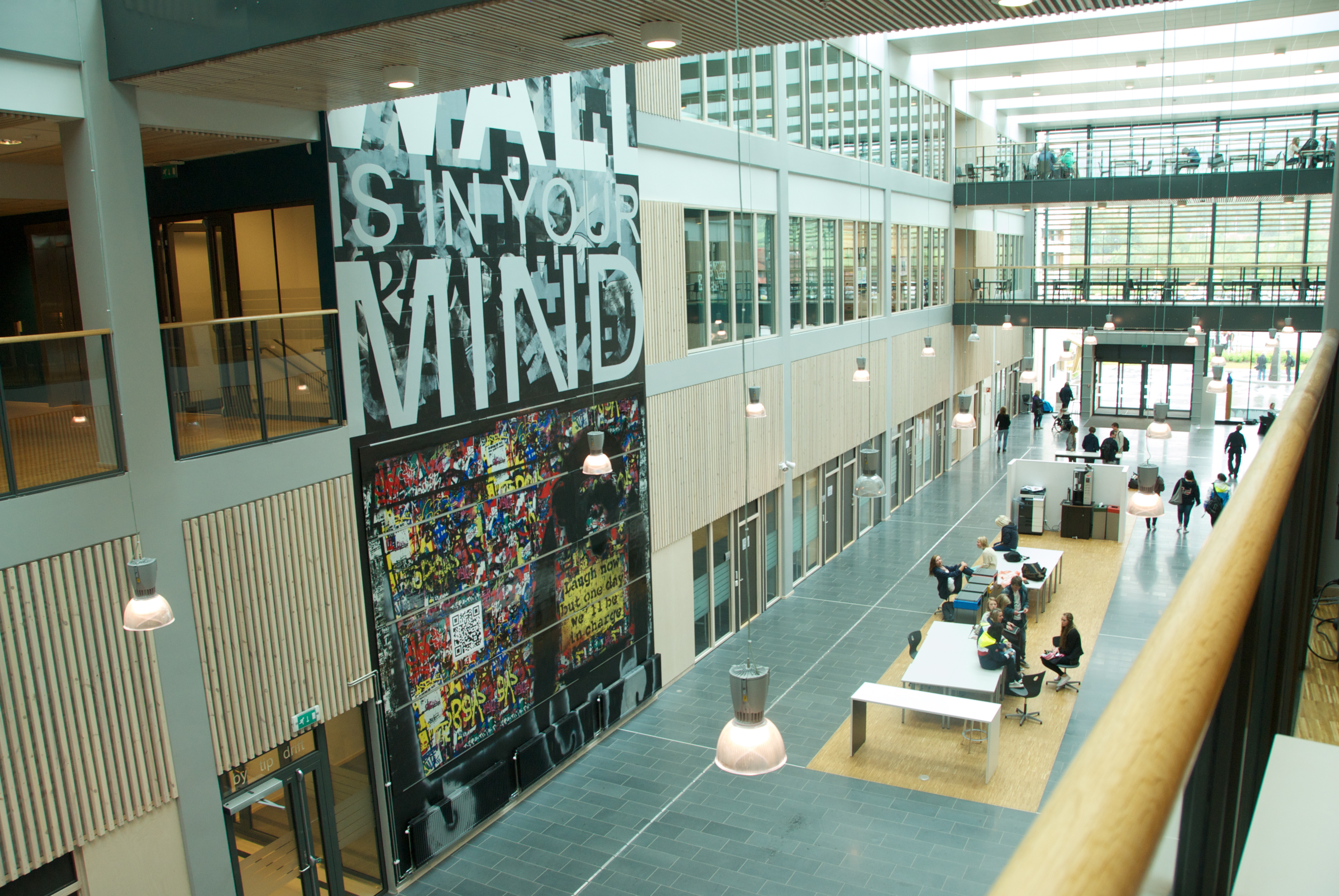 Porselenstavle med silketrykk og veggmaleri på betong. Høyde 14 m bredde: 6,5 m